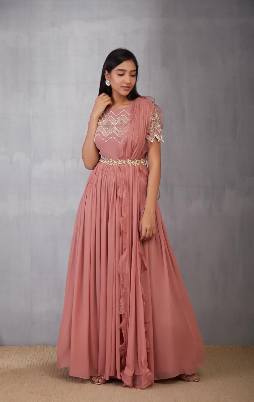 Pink pearl anarkali flared gown with attached ruffle dupatta. Comes with a bead-embellished belt